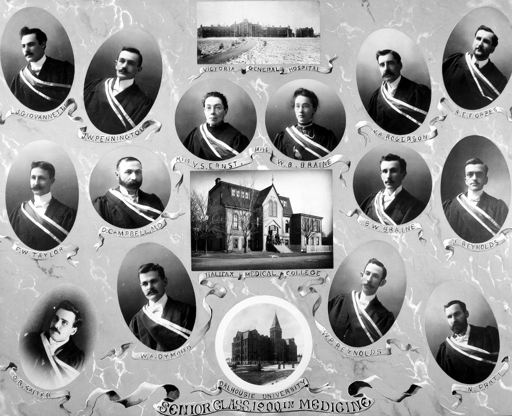 “The graduation photo of my maternal grandfather (L.B.W. Braine, 2nd row) from the Halifax Medical College, Dalhousie University, Class of 1900. There is an interesting family anecdote on how my grandfather came to study medicine and become a GP doctor. His sister, my great aunt Winnifred (W.B. Braine, top row), had her heart set on becoming a doctor, but in Victorian era Halifax with its social climate of male dominance this was next to impossible even to consider for a woman. My great grandfather who was manager of the Merchant Bank and a pillar of society, decreed that the only way she could enter Dalhousie Medical College was if her brother also attended with her. Thus, it was that the two siblings studied together and both became medical doctors, with Winnifred becoming one of the first woman doctors to graduate from Dalhousie University. Winnifred went on to marry classmate W.P Reynolds (bottom row) and they moved to Montana to practice medicine in a Wild West mining town. My grandfather practiced in Chester, Annapolis Royal and Glen Margaret.” ~ David Clark
